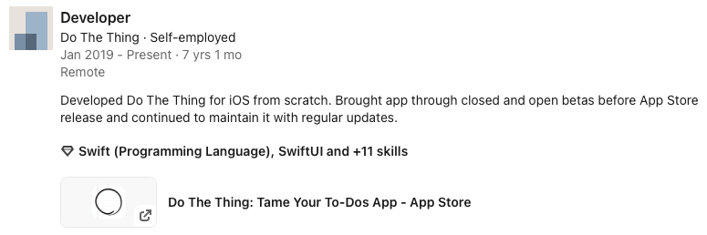I’ve struggled to claim those skills and call myself a “real” app developer, and I want to push back harder against that this year. I’m proud of Do The Thing. It’s a good little app. If I were a mediocre man, I would’ve already parlayed it into a good-paying job. I wouldn’t have wasted time wondering if I deserved to take up space at the table with the big-boy software engineers. What’s the harm in trying to reap the rewards of my hard work?